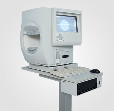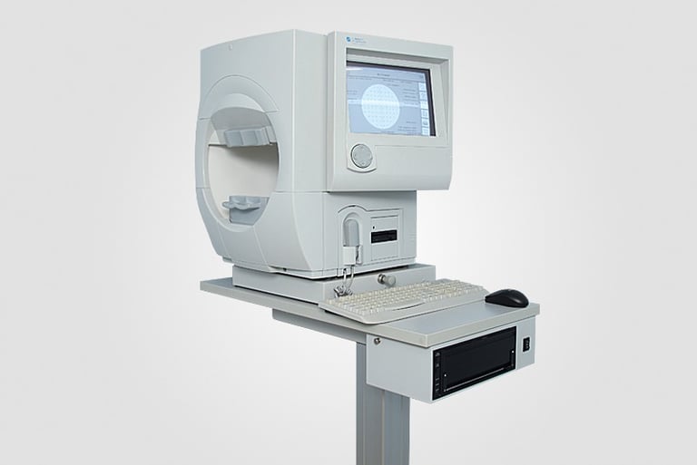 O exame de Campo Visual avalia a visão periférica e identifica áreas de perda visual. É fundamental no diagnóstico e controle do glaucoma e de doenças do nervo óptico e da retina.